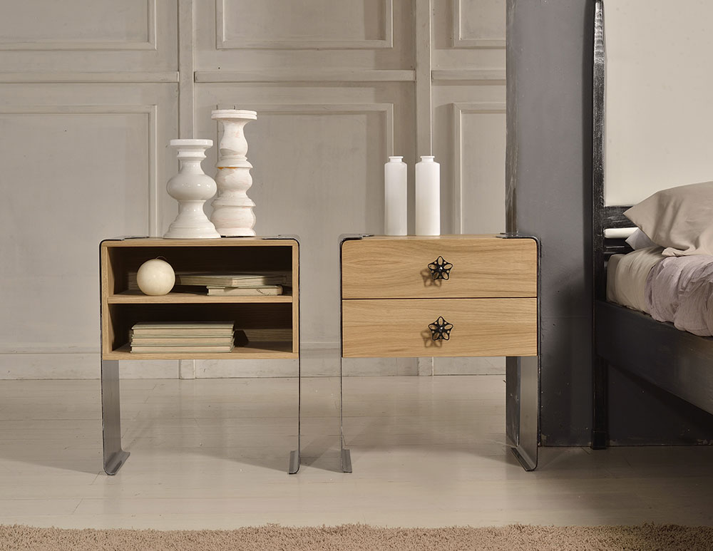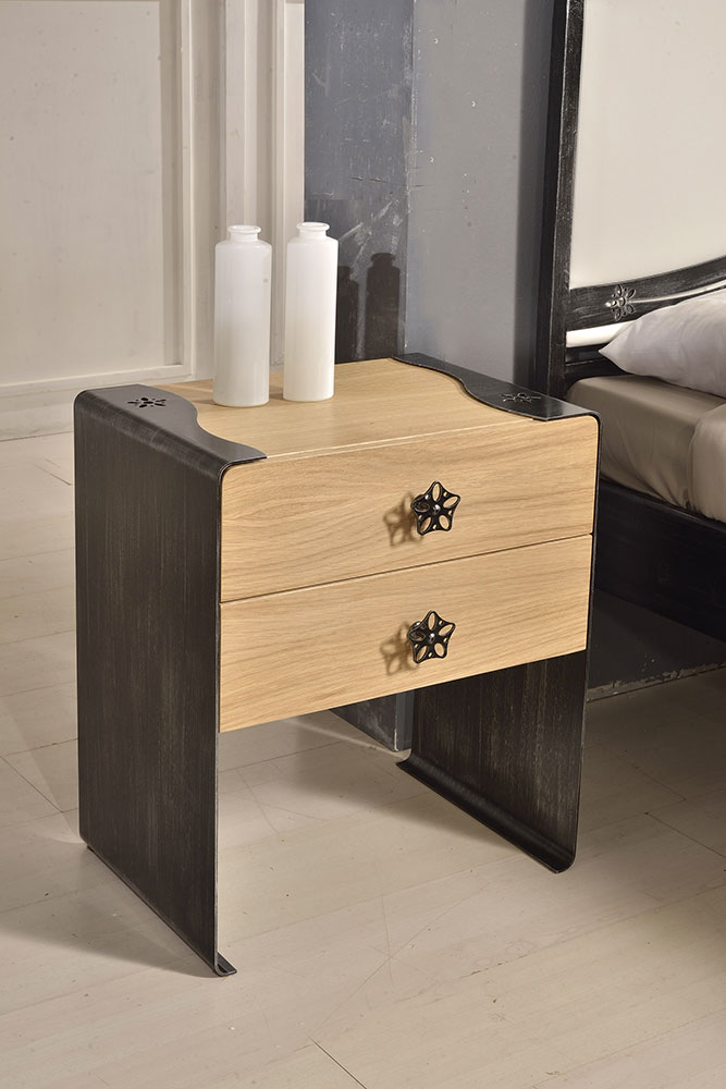 Comodino in lamiera con ripiano in rovere naturale a due cassetti.