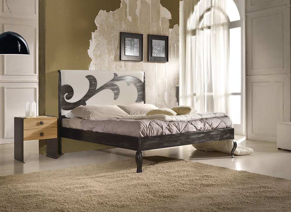 Letto in ferro con testata imbottita in ecopelle bianca.