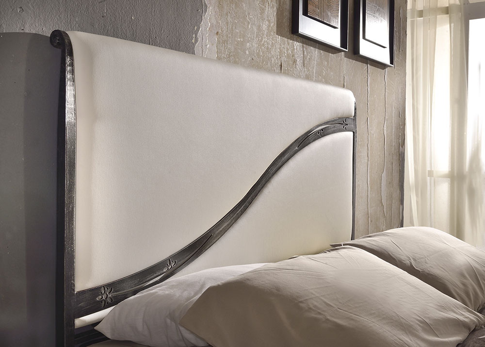 Letto in ferro Sissi con testata imbottita in ecopelle bianca.